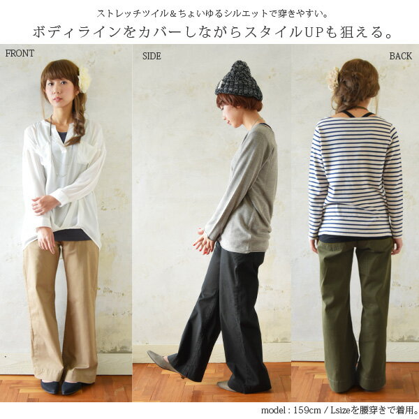 ストレッチパンツ レディース ストレッチツイルセミワイドパンツ【M】【L】【LL】【3L】【4L】ワイドパンツ パンツ バギーパンツ ゆったり ワイド カーキ イージーパンツ ストレートワイドパンツ 黒 秋 パンツ 【メール便不可】